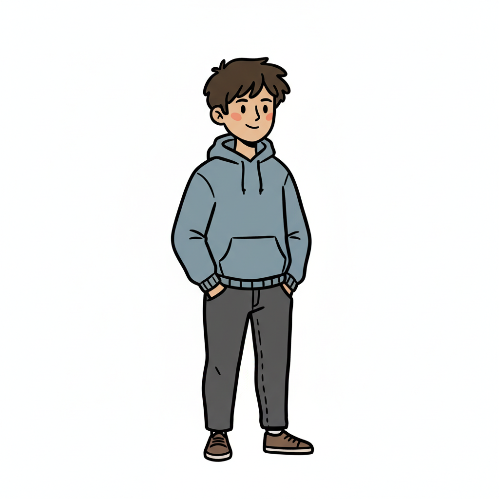 Cartoon eines lächelnden jungen Mannes in blauem Hoodie und grauer Hose, Hände in den Taschen.