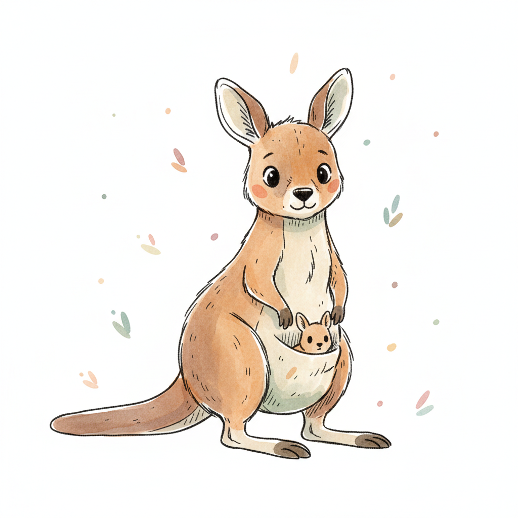 Niedliches, cartoonhaftes Känguru mit großen Augen und fröhlichem Ausdruck.