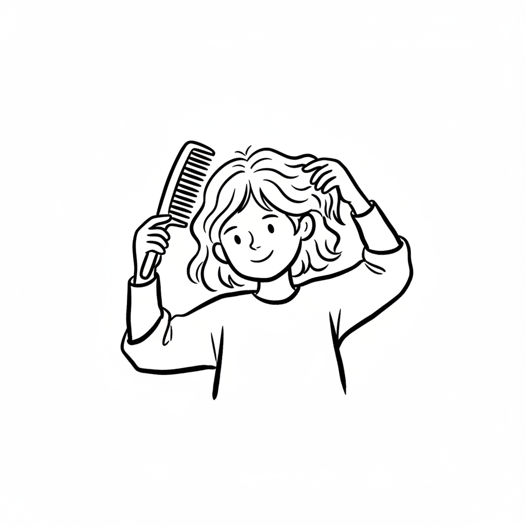 Junge mit lockigem Haar, der einen Kamm benutzt und lächelt.