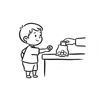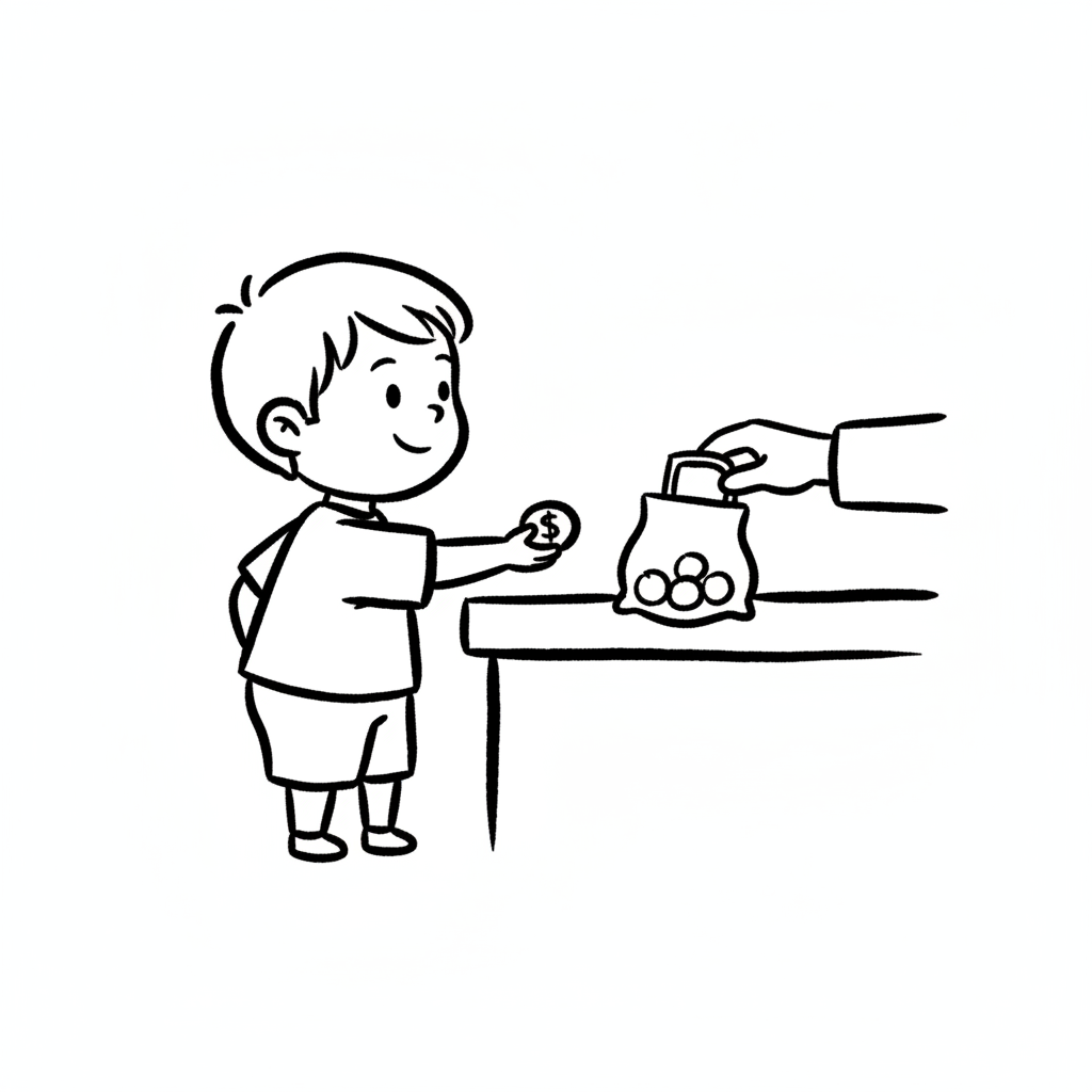 Ein lächelnder Junge hält eine Münze, während eine Hand Geld aus einem Beutel nimmt.