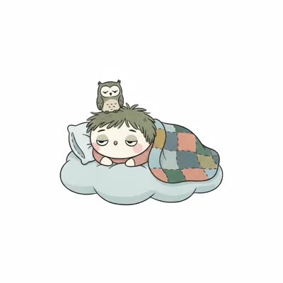 Ein schlafendes Kind mit einer Eule auf dem Kopf auf einer Wolke.