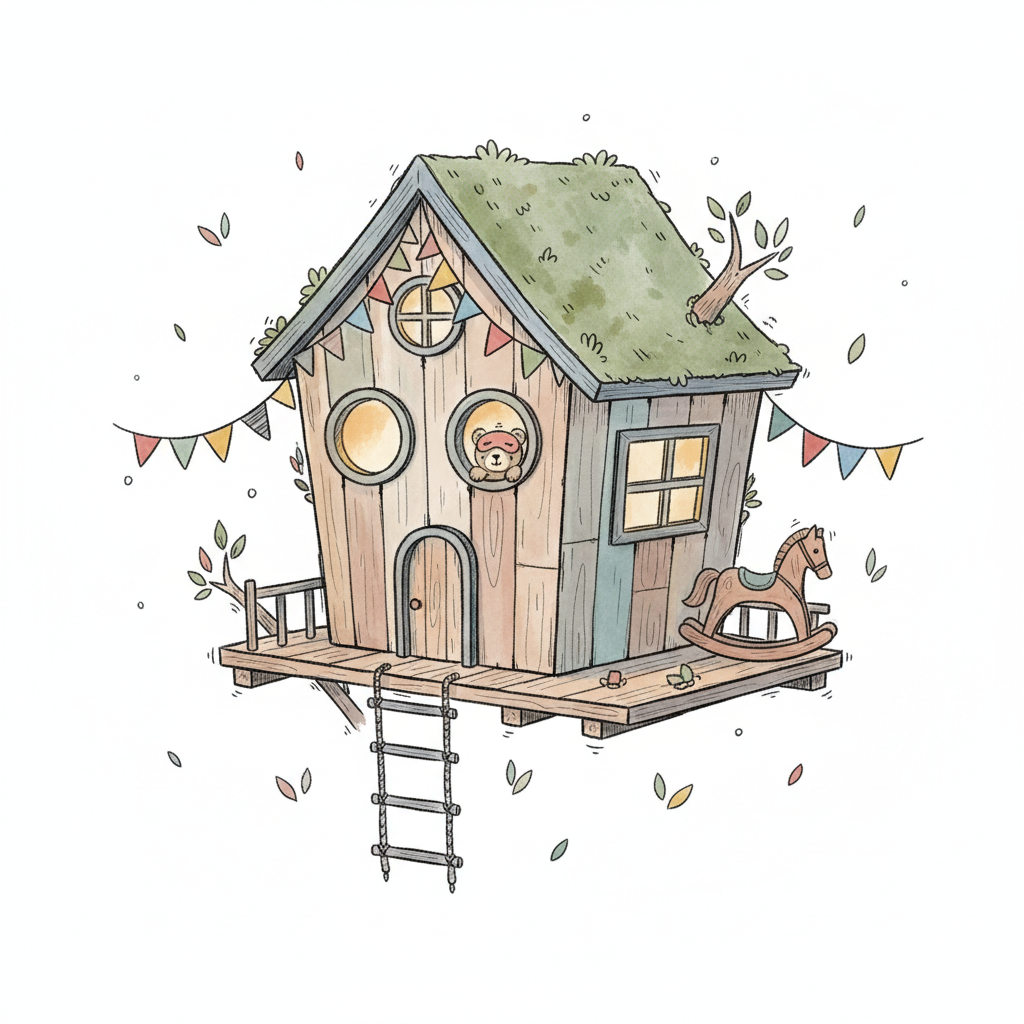 Buntes Spielhaus mit Fenster, Fahnen und einem Spielpferd davor.