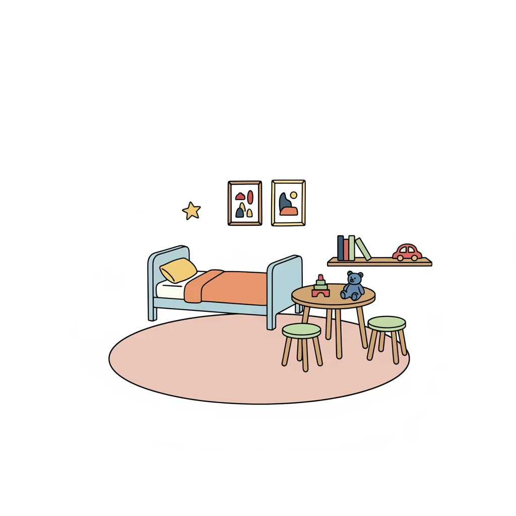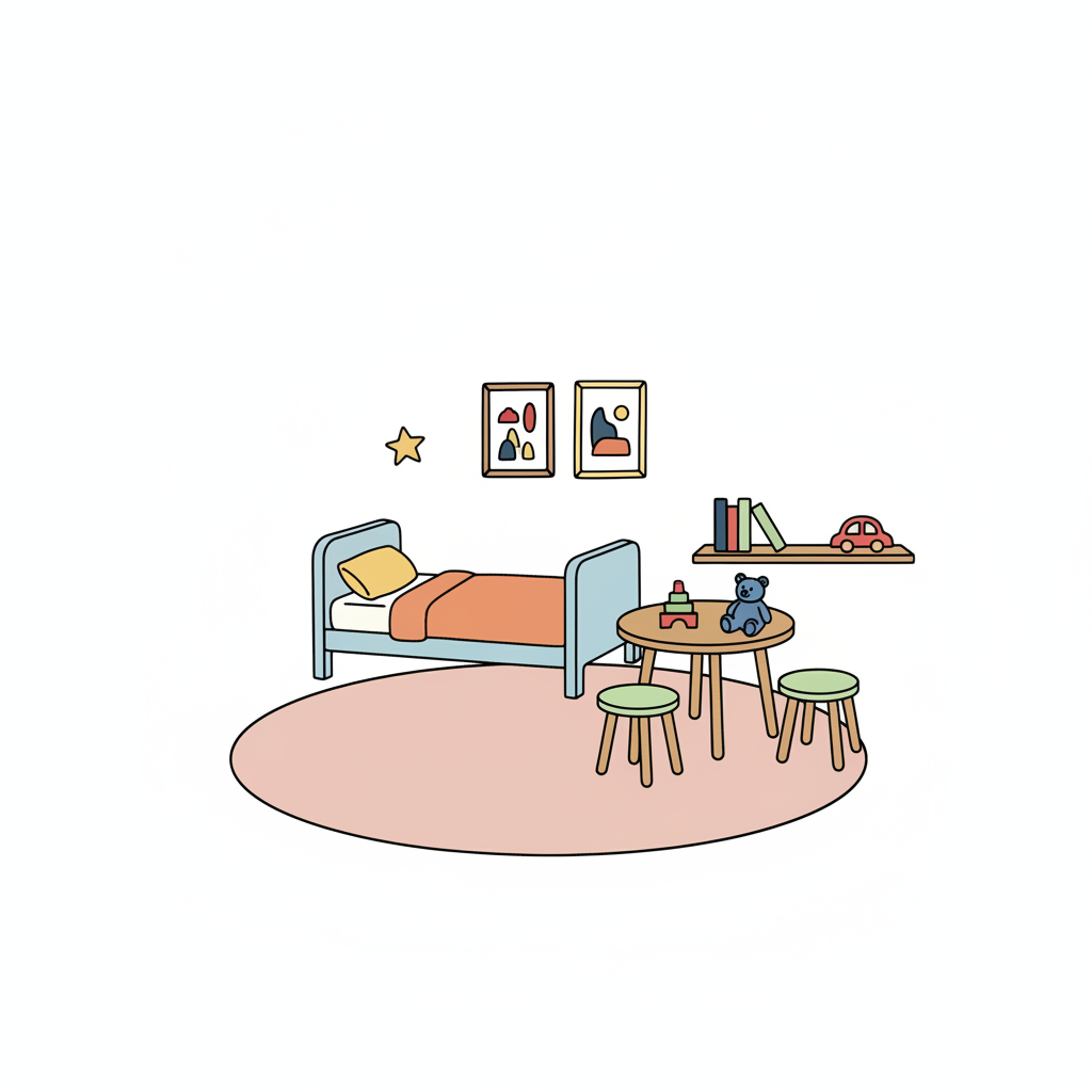Bunt gestaltetes Kinderzimmer mit Bett, Tisch und Spielzeug.