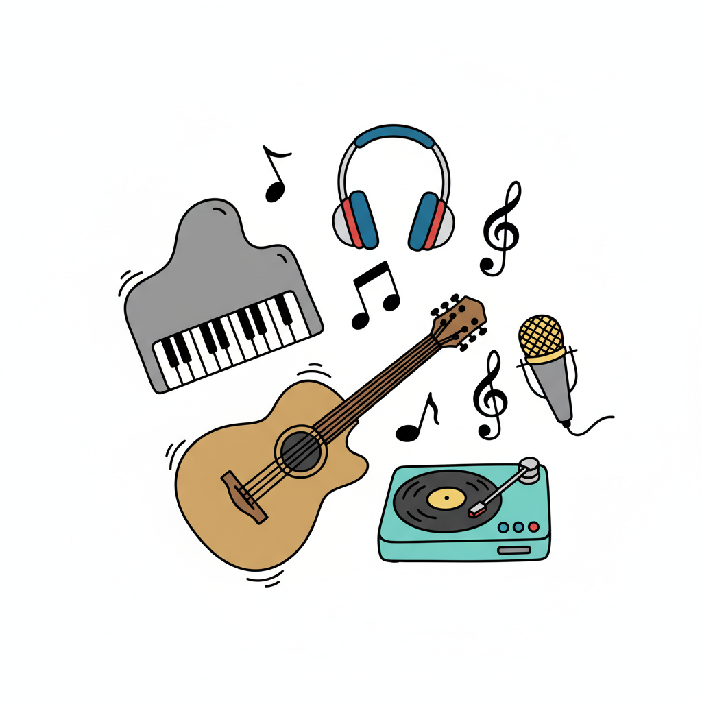 Musikillustration mit Klavier, Gitarre, Kopfhörern und Schallplatte.