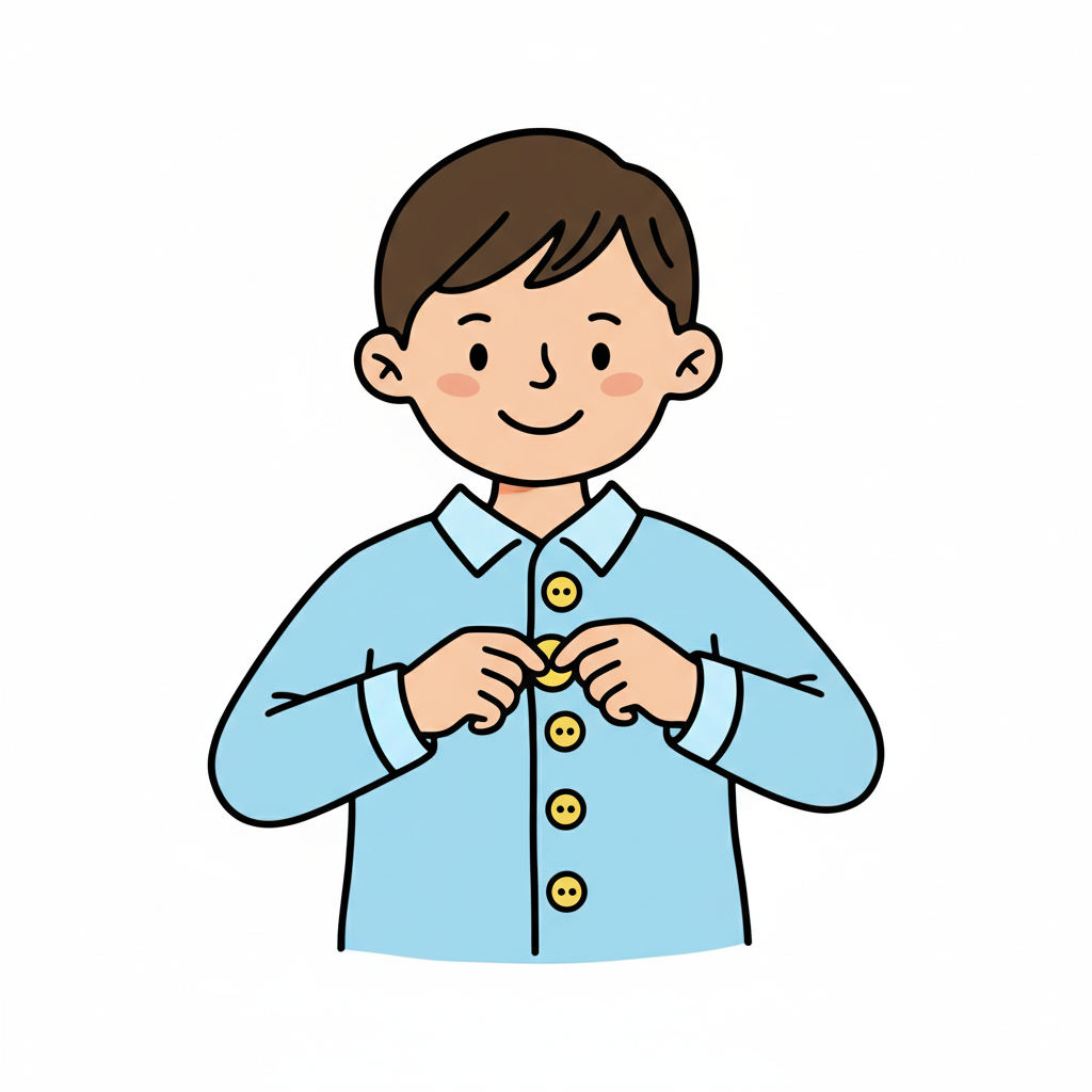 Ein Junge knöpft sein blaues Hemd zu und lächelt.