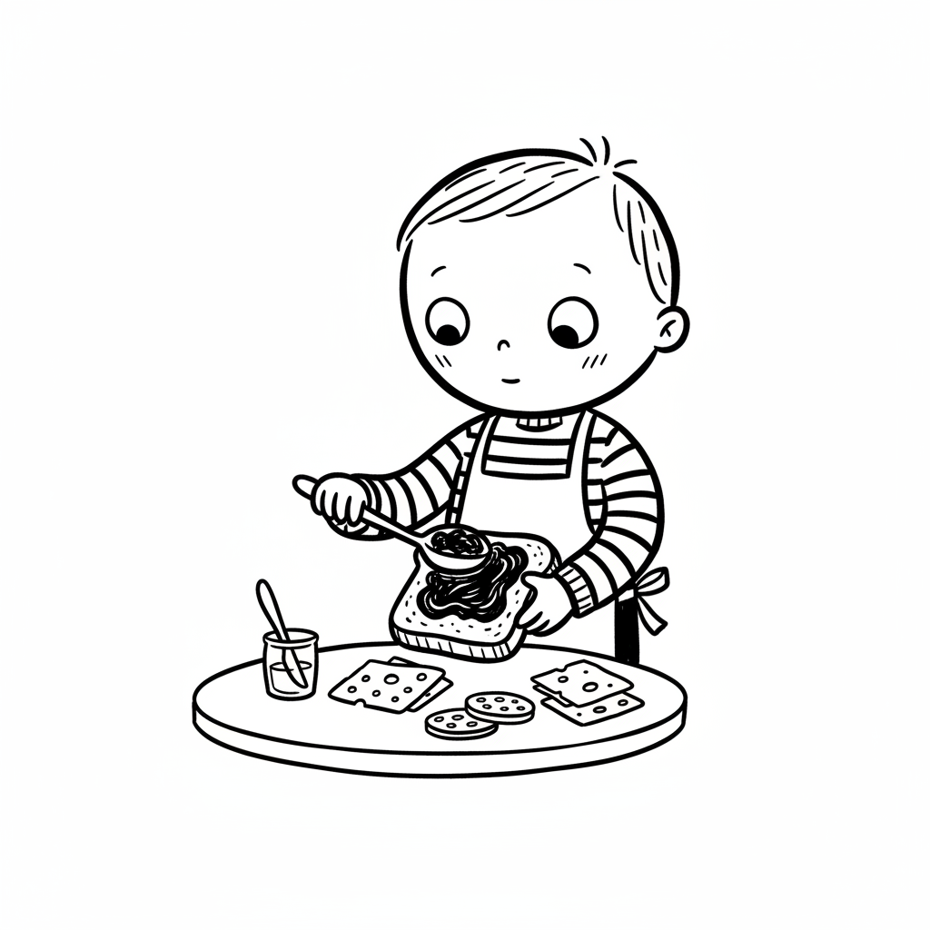 Ein Junge bereitet ein Brot mit Aufstrich und Keksen vor.