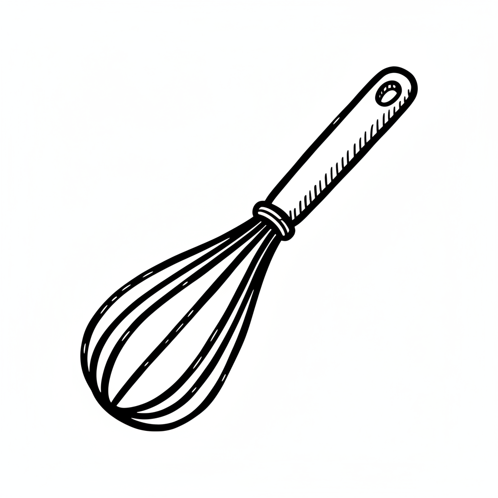 Ein einfacher Schneebesen mit einem langen Griff und vielen Drähten.