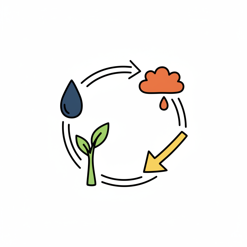 Illustration des Wasserkreislaufs mit Tropfen, Pflanze und Regenwolke in einem Kreislauf.