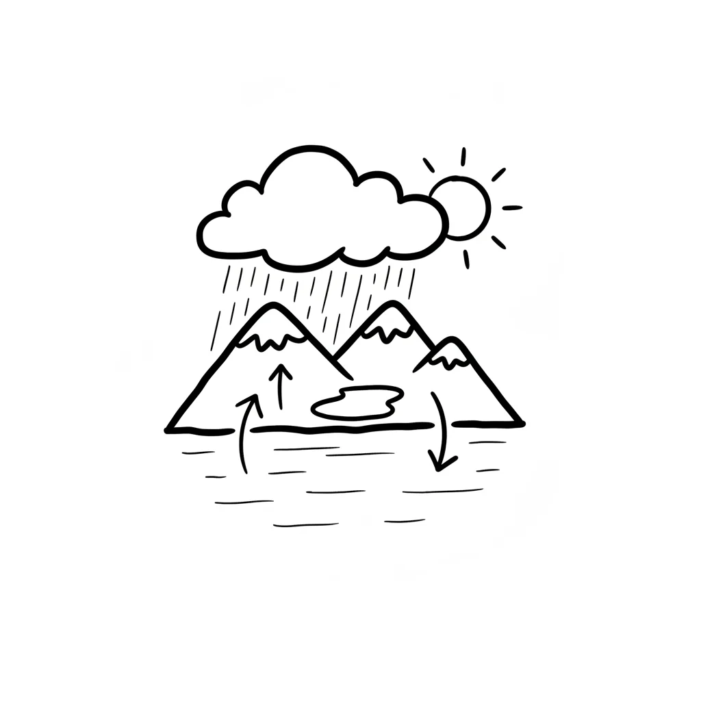 Handgezeichnete Darstellung des Wasserkreislaufs mit Sonne, Wolke, Regen, Bergen und Wasser.
