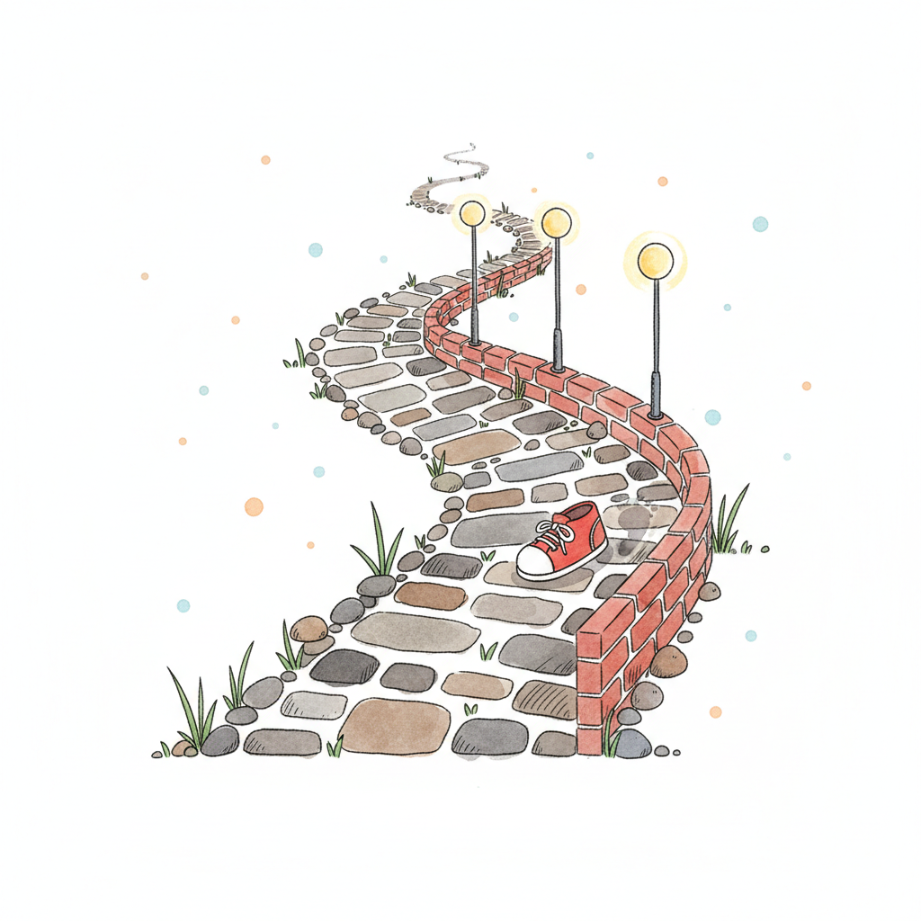 Ein gewundener Weg mit Laternen und einer roten Schuh.