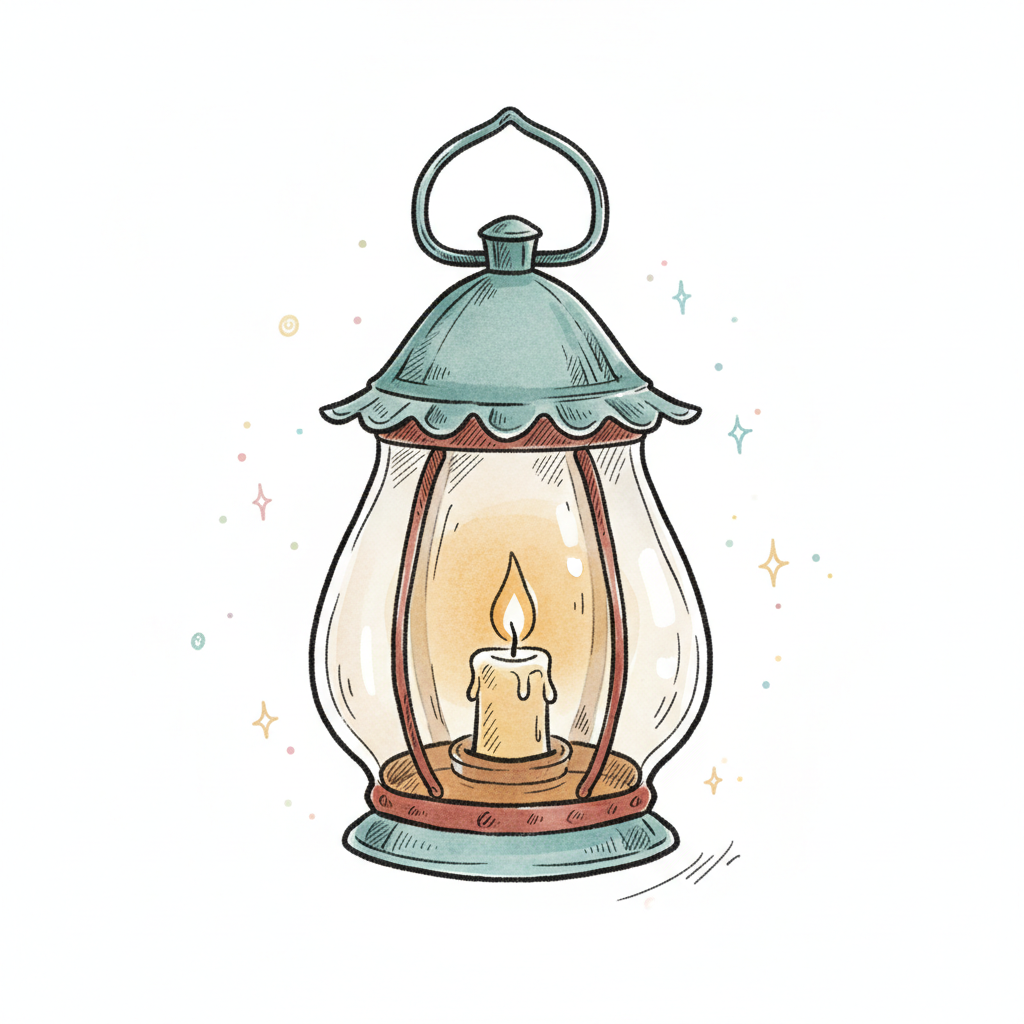 Eine stilisierte Laterne mit einer Flamme im Inneren.