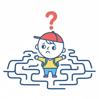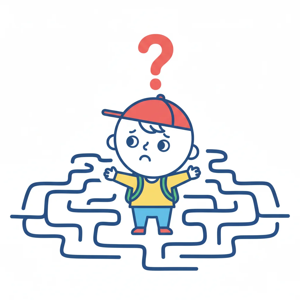 Ein Junge steht verwirrt in einem Labyrinth mit Fragezeichen über ihm.