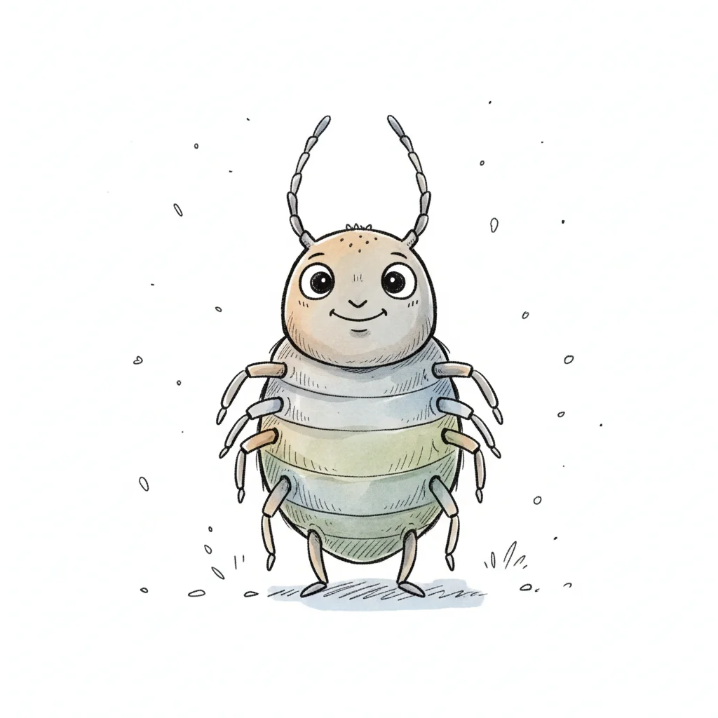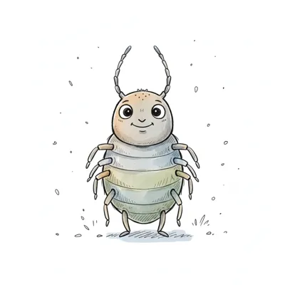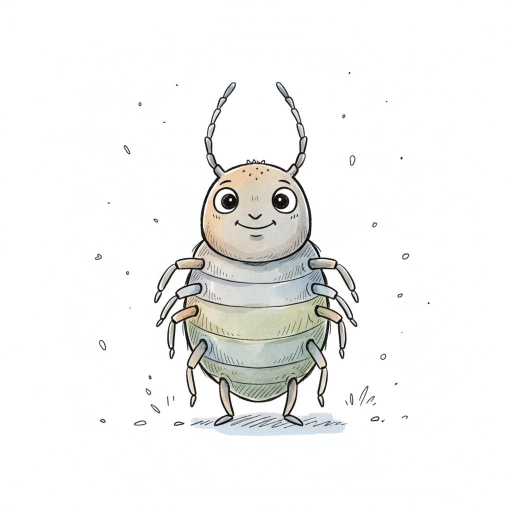 Ein cartoonhaftes Insekt mit einem freundlichen Gesicht und mehreren Beinen.