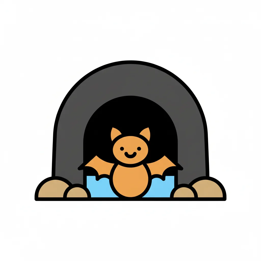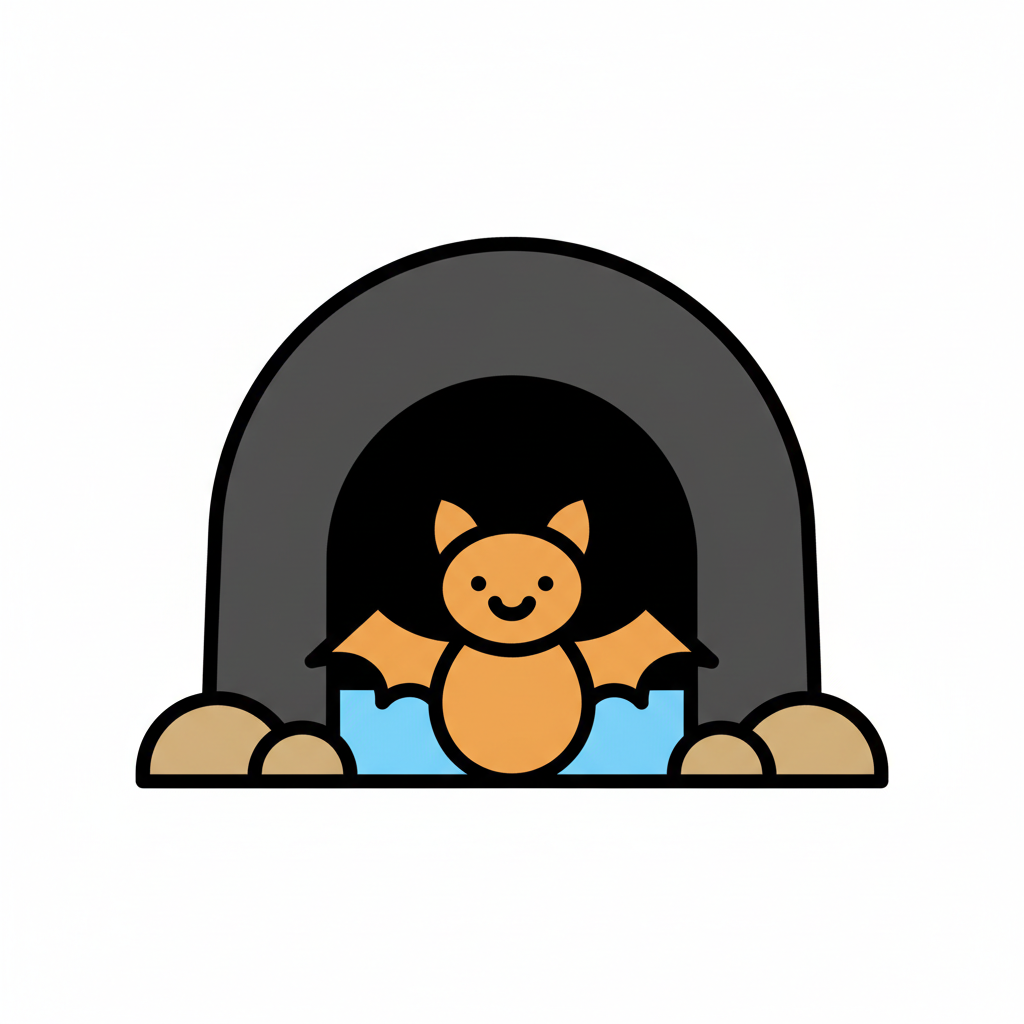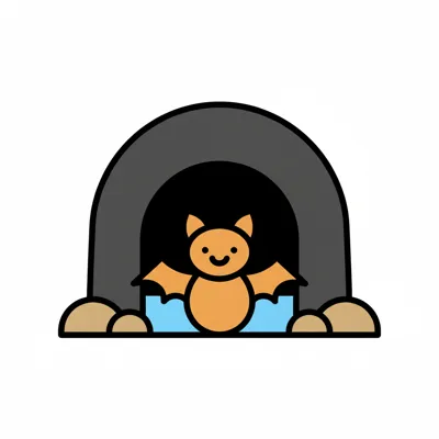 Eine lächelnde orangefarbene Cartoon-Fledermaus fliegt aus einer dunklen Höhle.
