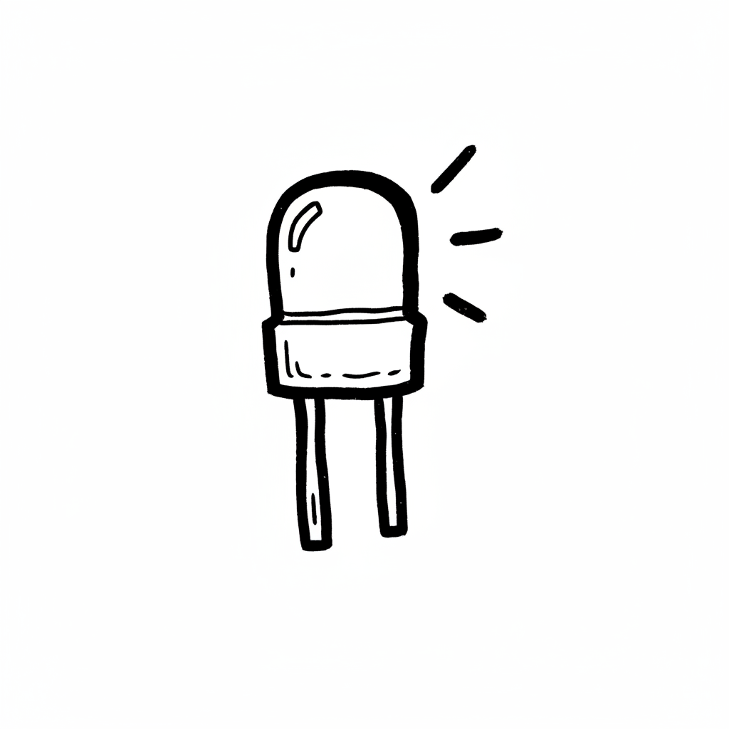 Handgezeichnete Skizze einer leuchtenden LED mit zwei Anschlüssen auf weißem Hintergrund.