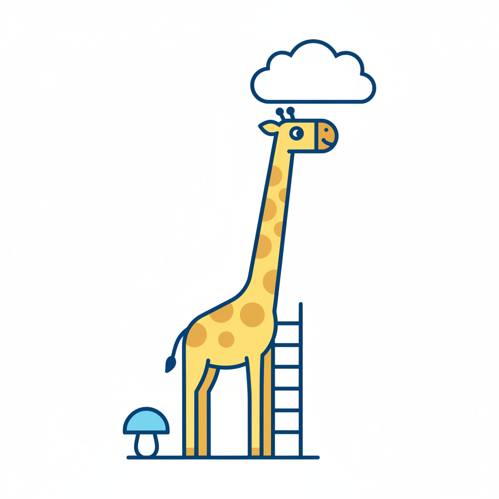 Niedliche Cartoon-Giraffe mit Wolke über dem Kopf, Leiter und blauem Pilz.