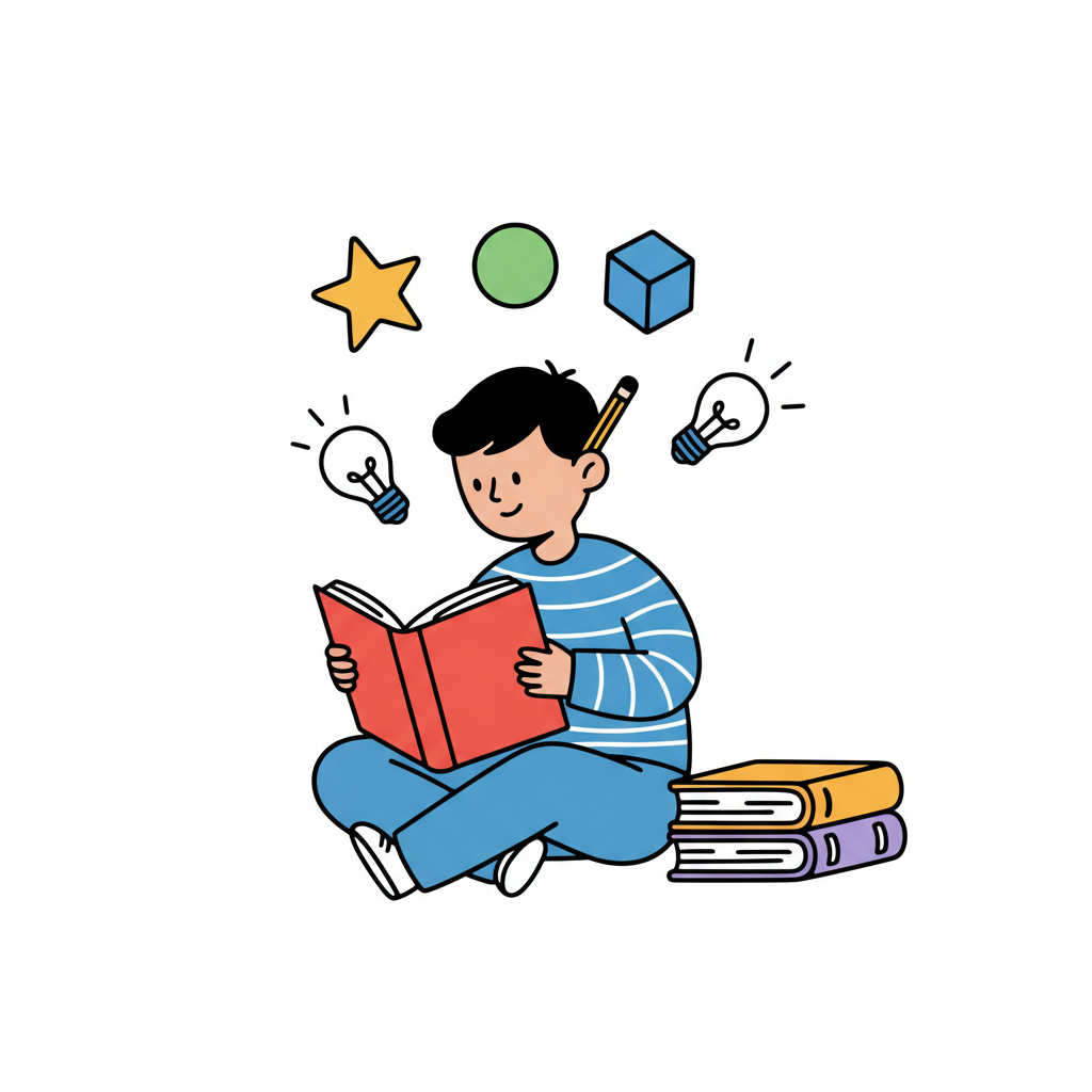 Junge liest ein Buch, umgeben von Formen und Glühbirnen.