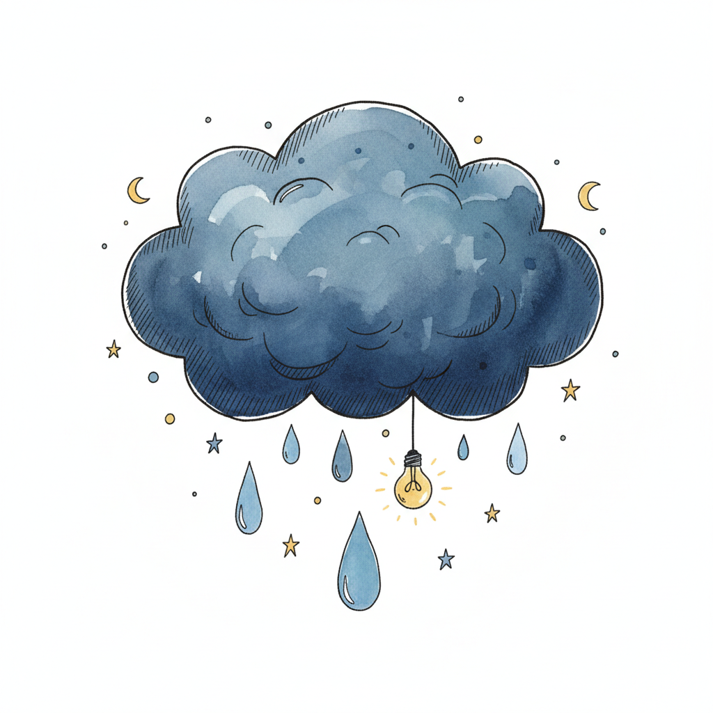 Aquarell-Wolke mit Regentropfen und einer leuchtenden Glühbirne, umgeben von Sternen und Monden.