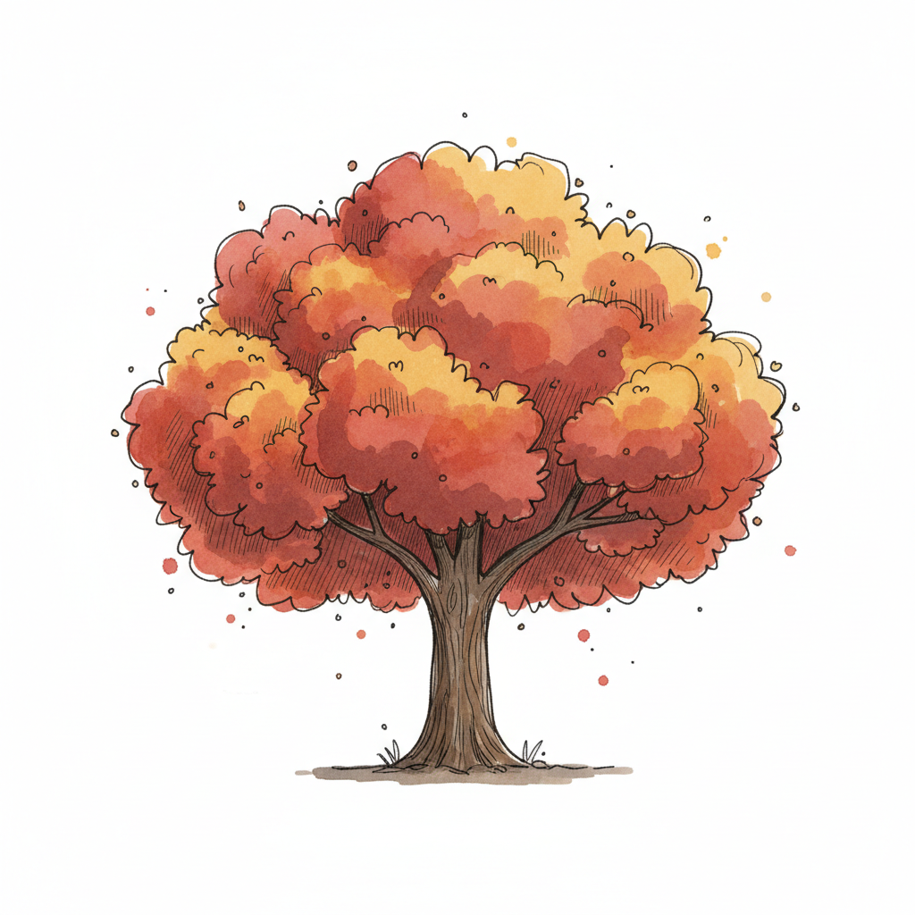 Stilisierter Baum mit leuchtend roten und orangefarbenen Herbstblättern, gezeichnet im Aquarellstil.