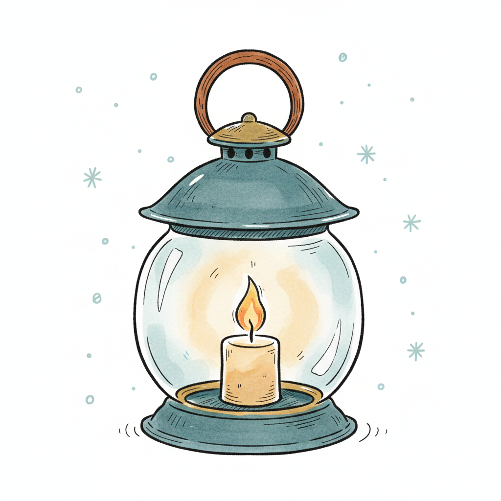 Handgezeichnete Laterne mit leuchtender Kerze und zarten Schneeflocken im Hintergrund.