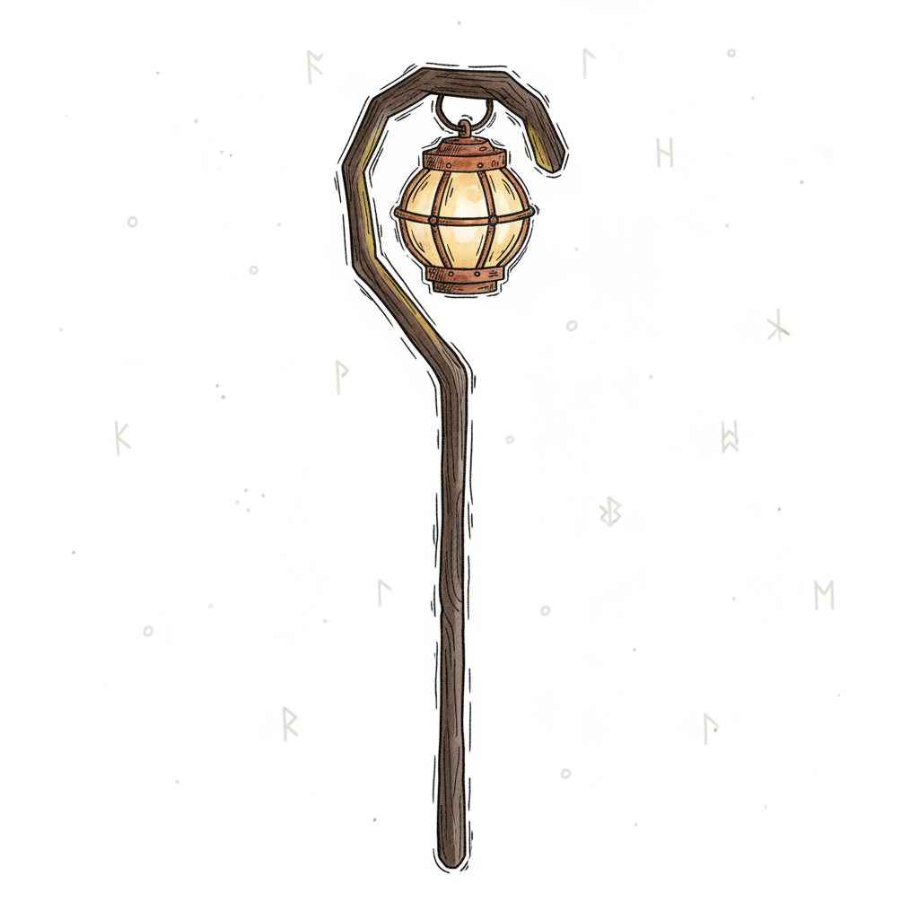Illustration eines Holzstabs mit leuchtender Laterne, umgeben von Runen auf weißem Grund.