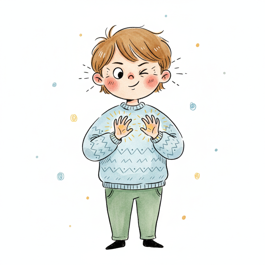 Ein fröhlicher Cartoon-Junge zwinkert, seine Hände leuchten. Er trägt einen blauen Pullover.