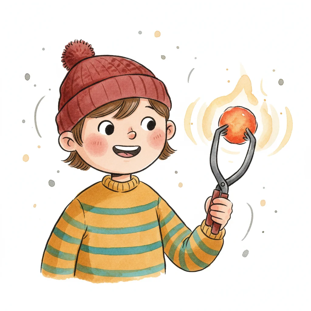 Glückliches Kind in Winterkleidung hält mit Zange eine leuchtende, orangefarbene Kugel.