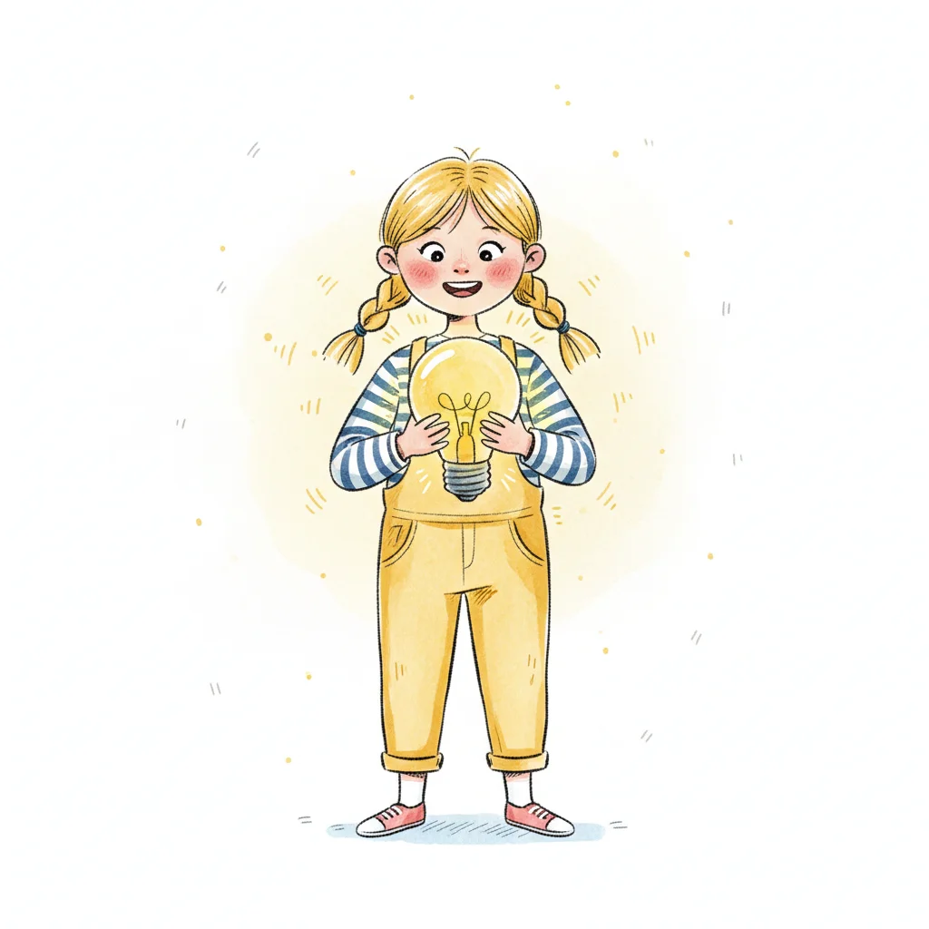 Ein lächelndes Mädchen mit Zöpfen hält eine leuchtende Glühbirne, die eine Idee symbolisiert.