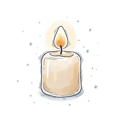 Gemalte Kerze mit leuchtender Flamme im Aquarell-Stil, umgeben von kleinen Sternen und Punkten.