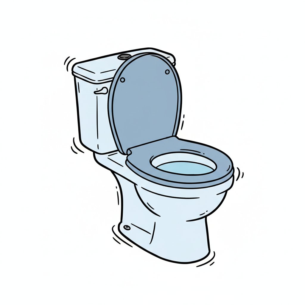 Weiße Toilette mit offenem blauem Deckel und Sitz, umgeben von Wellenlinien, im Cartoon-Stil.