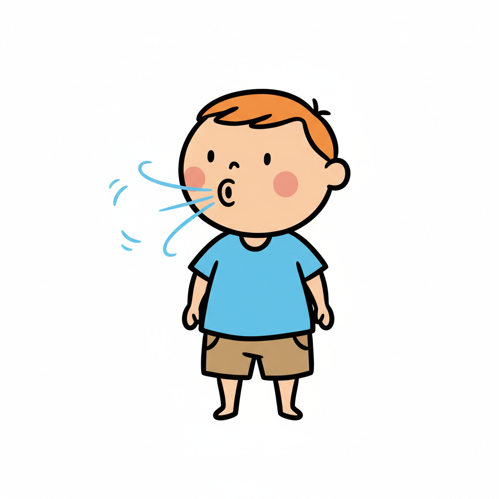 Ein niedlicher Cartoon-Junge bläst Luft aus seinem Mund, dargestellt durch blaue Linien.