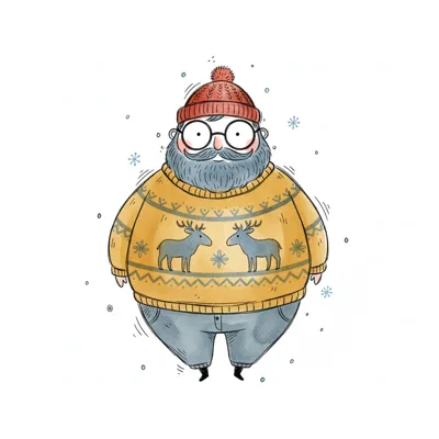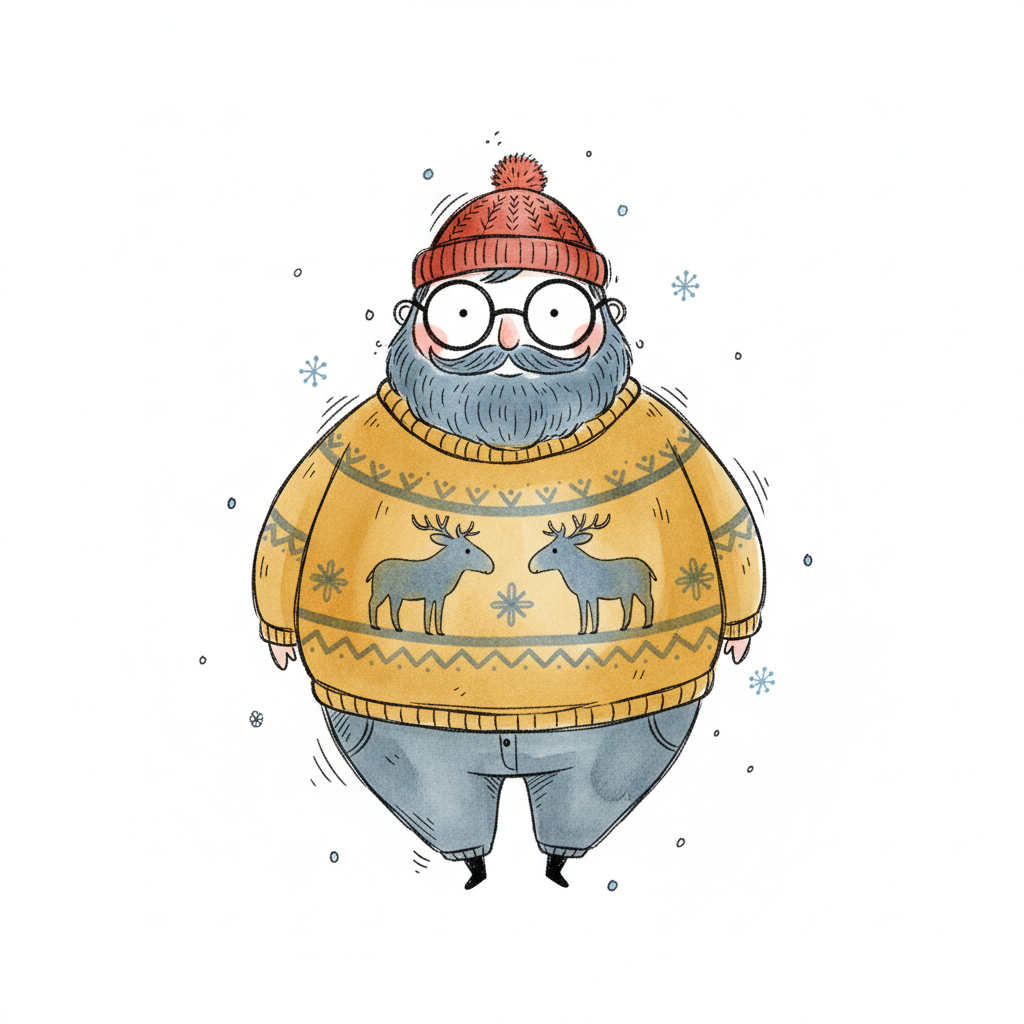 Bärtiger Mann mit Brille, roter Mütze und gelbem Rentierpullover, umgeben von Schneeflocken.