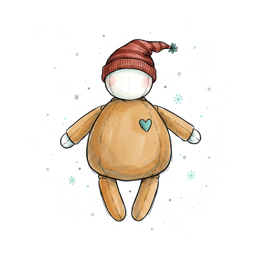 Süße Stoffpuppe mit roter Mütze und blauem Herz, umgeben von zarten Schneeflocken.