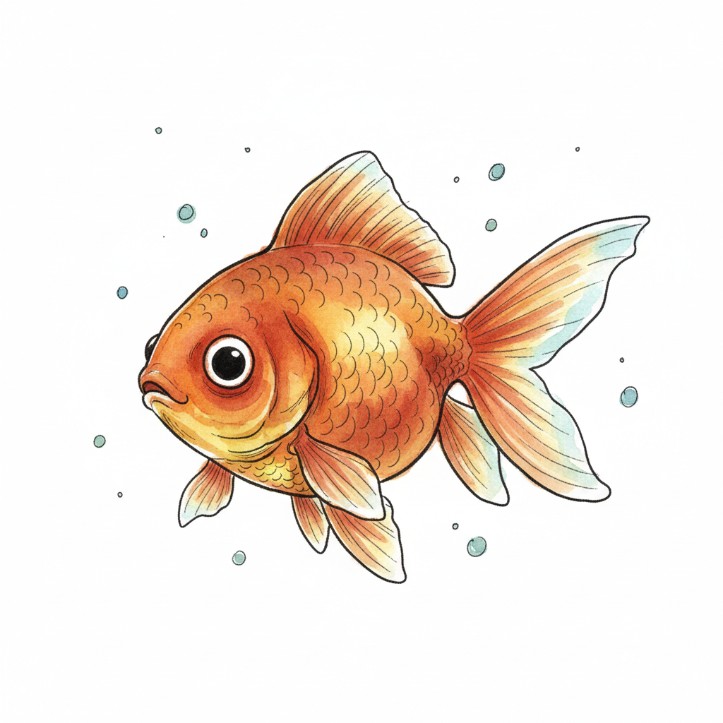 Illustration eines goldenen Fischs mit großen Augen und Flossen, umgeben von kleinen Blasen.
