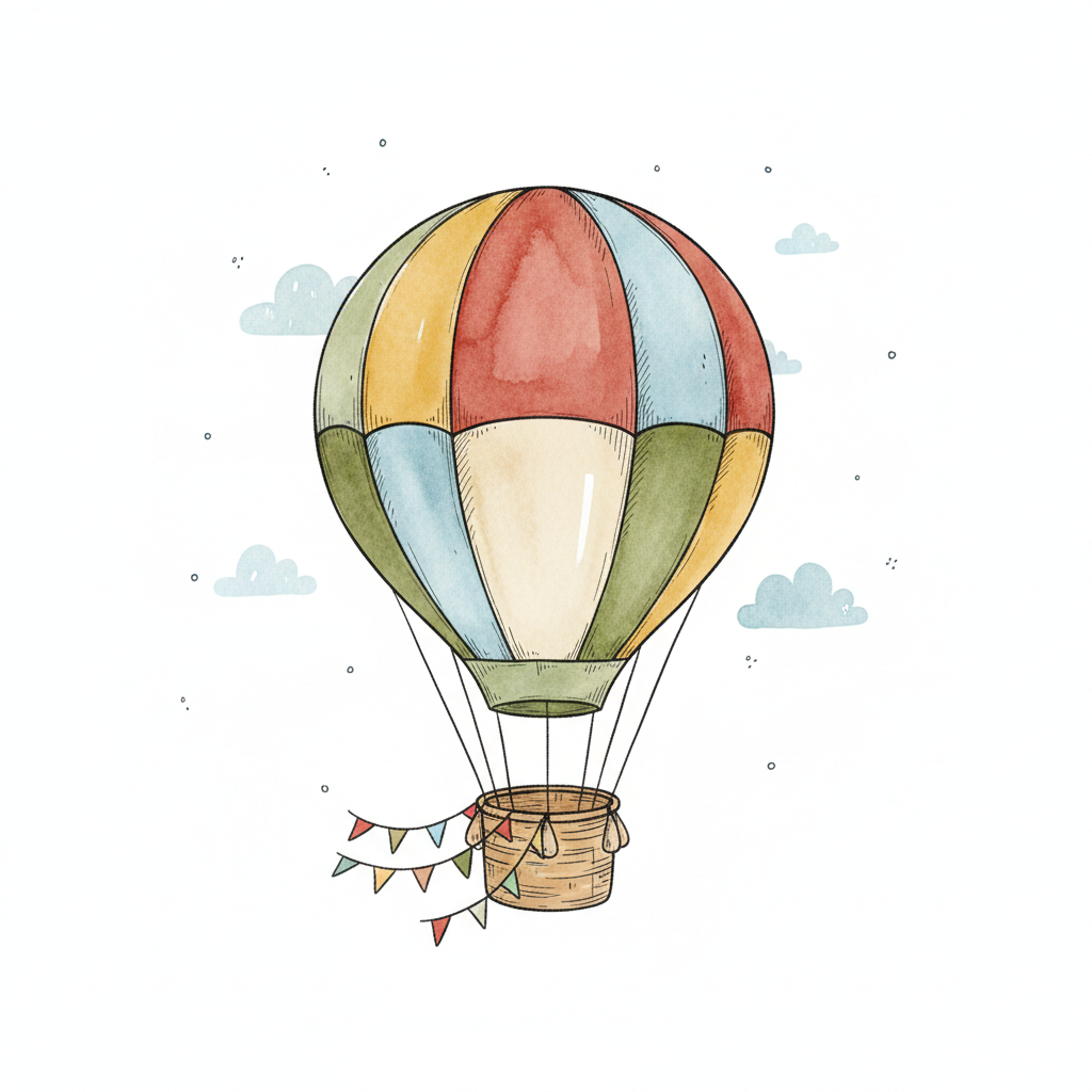 Buntes Heißluftballon-Aquarell mit Korb und Wimpelkette vor hellem Himmel mit Wolken.