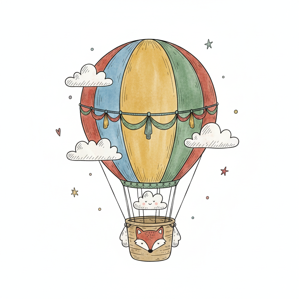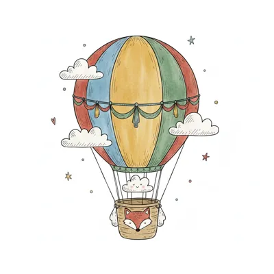 Niedlicher, bunter Heißluftballon mit Fuchskorb, Wolken und Sternen, im Aquarell-Stil.