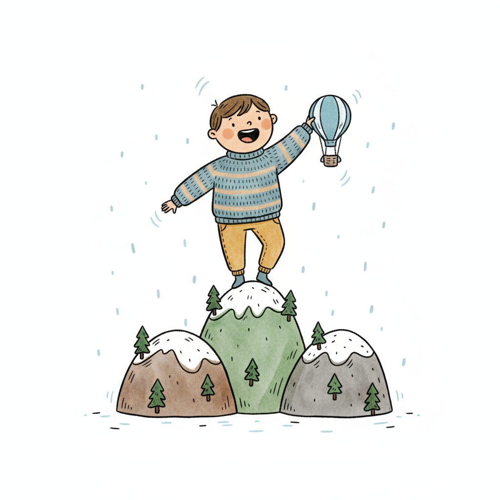 Fröhlicher Junge mit Heißluftballon auf schneebedecktem Berg. Kindliche Illustration.