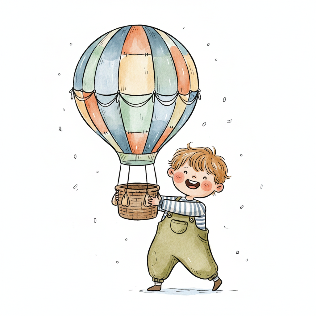 Ein fröhlicher Junge hält einen bunten Heißluftballon. Aquarell-Illustration.