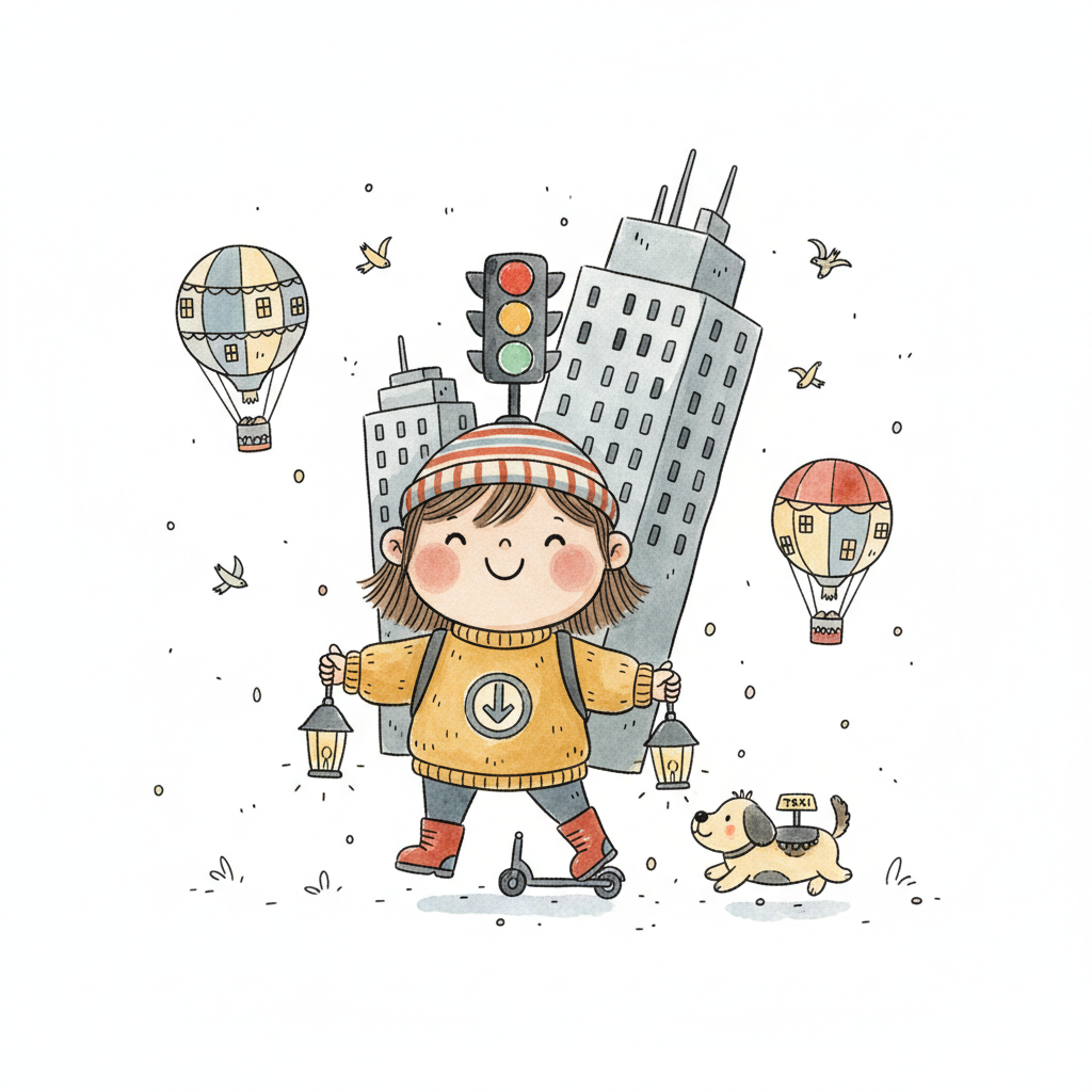 Fröhliches Mädchen auf Roller mit Laternen, Hund und Stadtkulisse mit Heißluftballons.