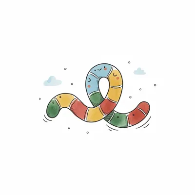 Ein süßer, bunter Cartoon-Wurm mit lächelndem Gesicht schwebt spielerisch in der Luft.
