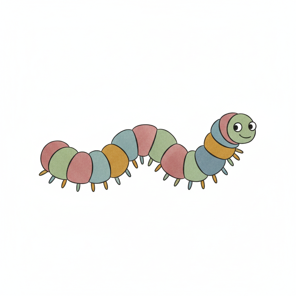 Eine bunte, cartoonartige Raupe mit einem lächelnden Gesicht.