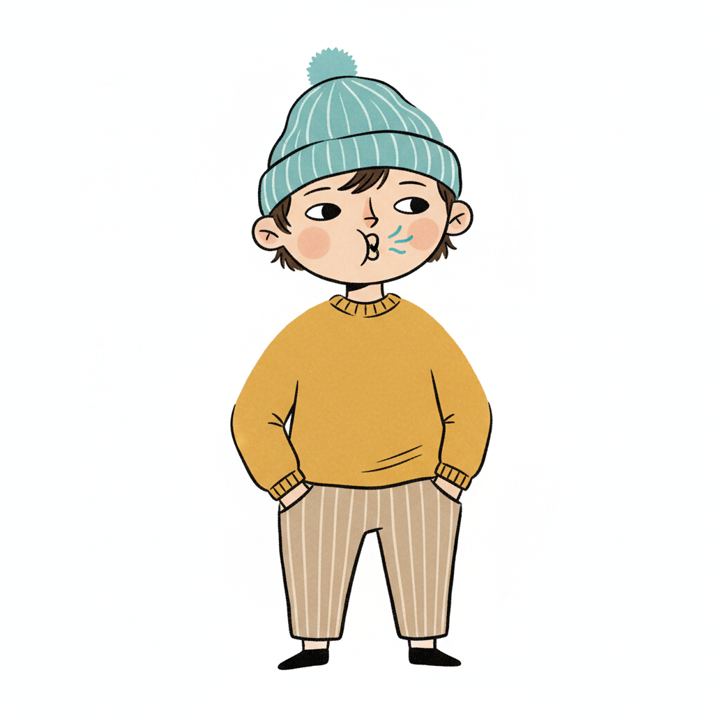 Handgezeichnete Kinderbuchillustration im modernen skandinavisch-nordischen Stil. Minimalistische, freundliche Figur mit einfachen Formen und leicht unregelmäßigen, handgezeichneten Linien. Ruhige, gedeckte Farbpalette, viel freie Fläche, reduzierte Details, sanfte Papier- oder Aquarellstruktur. Warme, ruhige, leicht humorvolle Stimmung, flächige Komposition ohne starke Perspektive, moderner nordischer Illustrationsstil, charmant und zeitlos.