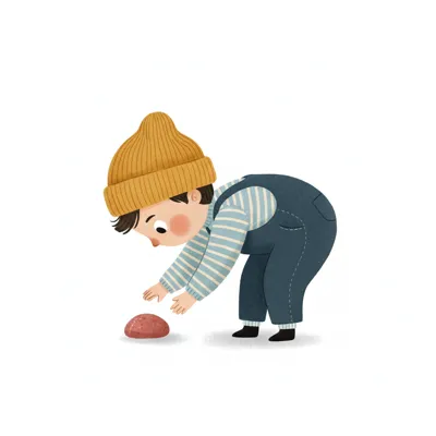 Ein Junge in einem gestreiften Shirt und Mütze bückt sich nach einem Stein.