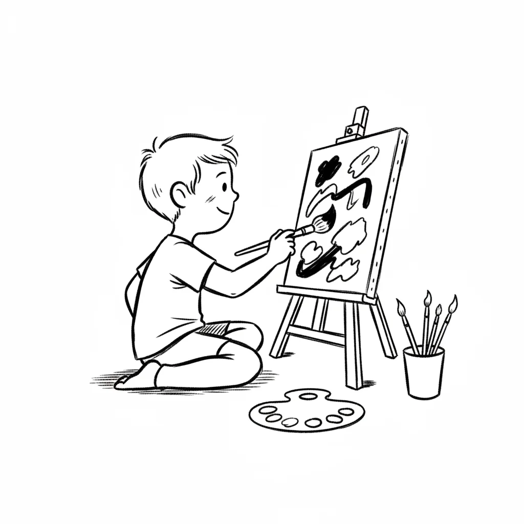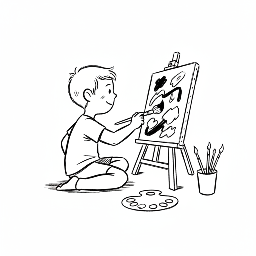 Ein Junge malt auf einer Leinwand mit Pinsel und Palette.