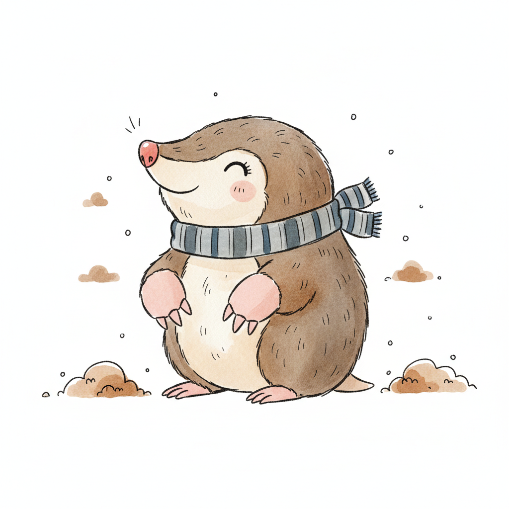 Ein fröhlicher Maulwurf mit einem gestreiften Schal in winterlicher Atmosphäre.