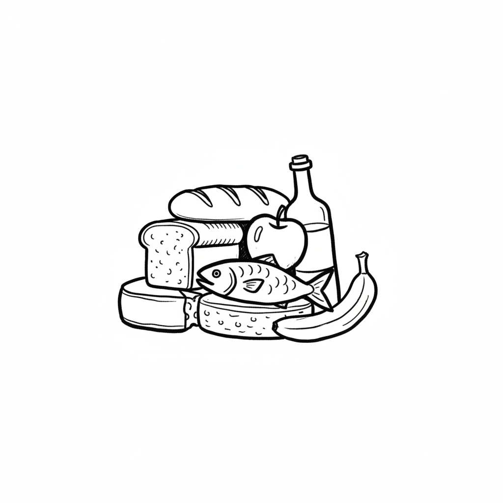 Handgezeichnete Skizze von Brot, Käse, Fisch, Obst und einer Flasche.