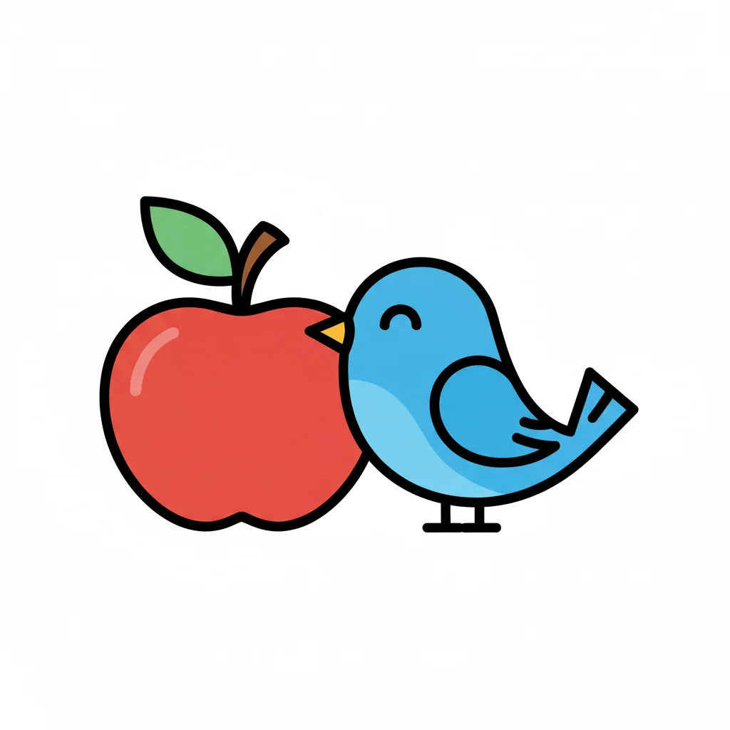 Blauer Cartoon-Vogel pickt an einem roten Apfel.
