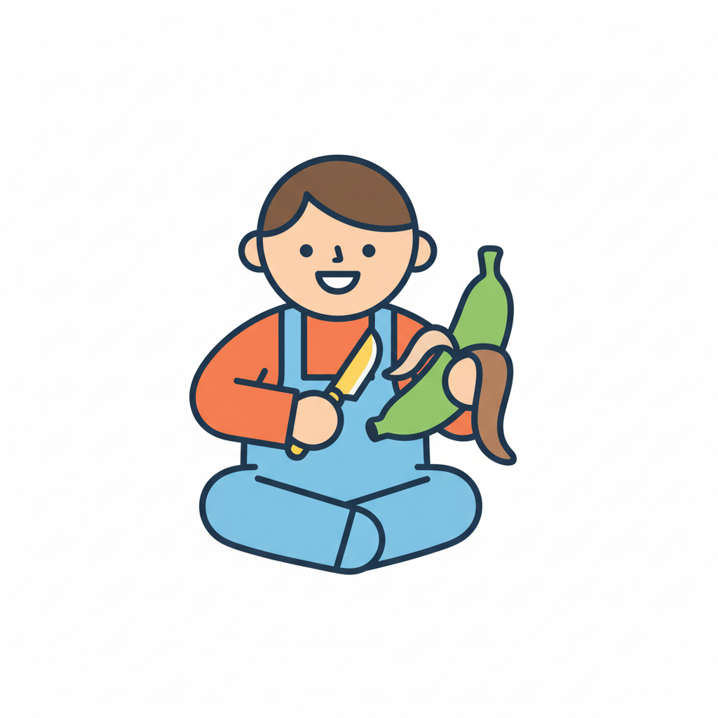 Cartoon-Figur schält lächelnd eine grüne Banane mit einem Messer, sitzt im Schneidersitz.