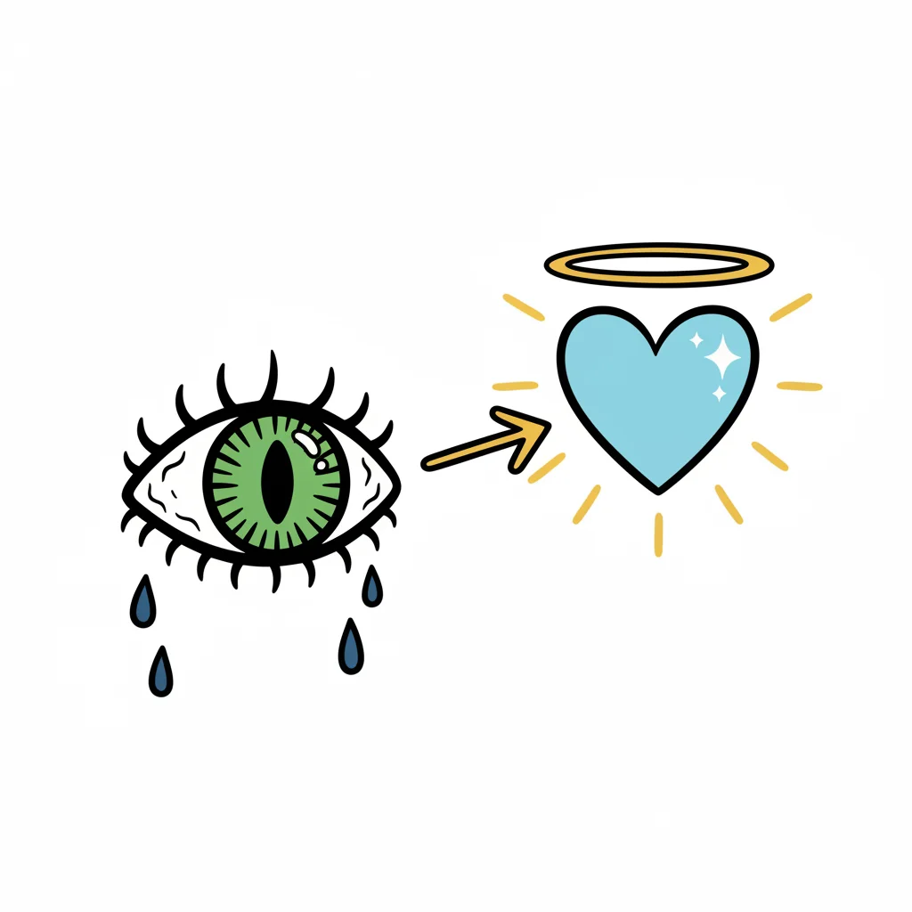 Ein weinendes Auge mit grüner Iris zeigt auf ein leuchtendes, von einem Heiligenschein umgebenes Herz.