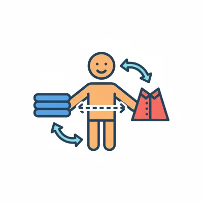 Icon: Person mit Maßband, Kleidung und Pfeilen, symbolisiert Anpassung oder Maßschneiderei.